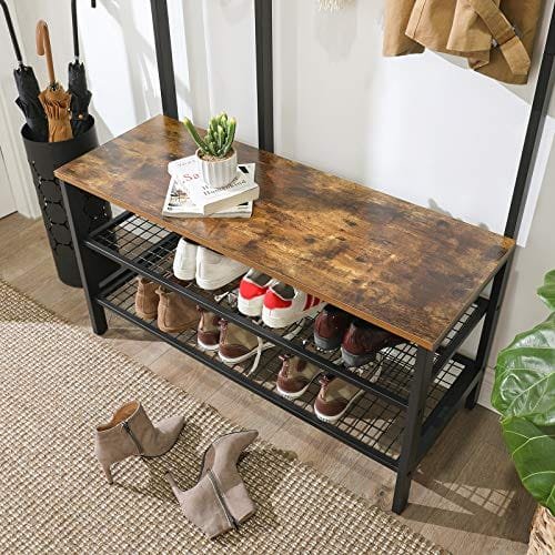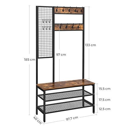 Specifikationer: Färg: Rustik brownmaterial: partikelplatta, järnproduktstorlek: 38,5 ”l x 15,7” W x 72,8 ”h (97,7 x 40 x 185 cm) Produktvikt: 38,8 lb (17,6 kg) max. Statisk lastkapacitet per krok: 6,6 lb (3 kg) max. Statisk belastningskapacitet för sätet: 220 lb (100 kg) max. Statisk lastkapacitet per rutnät Hylla: 44 lb (20 kg) Paketinnehåll: 1 x Coat Rack1 x Assembly Kit1 x Anti-Tip Kit1 x Instruktioner