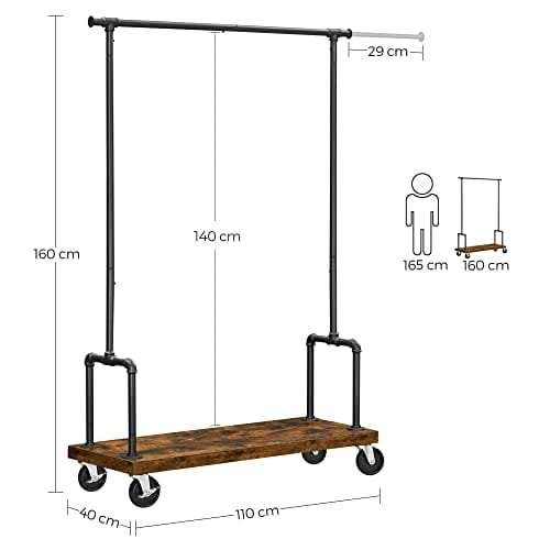Specifikationer: Färg: Vintage Brun/Svart Material: Träspånskiva, Stålstorlek: (110-168) x 40 x 160 cm (LXBXH). Vikt: 12,4 kg. Max. Statisk lastkapacitet i mellanbalken: 95,5 kg. Max. Statisk lastkapacitet per Utvidgbar sidobalk: 9 kg. Max. Hyllans statiska lastkapacitet: 25 kg box Innehåll: 1 x klädställ, 1 x tillbehörspaket, 1 x instruktioner (engelska språket garanteras inte)