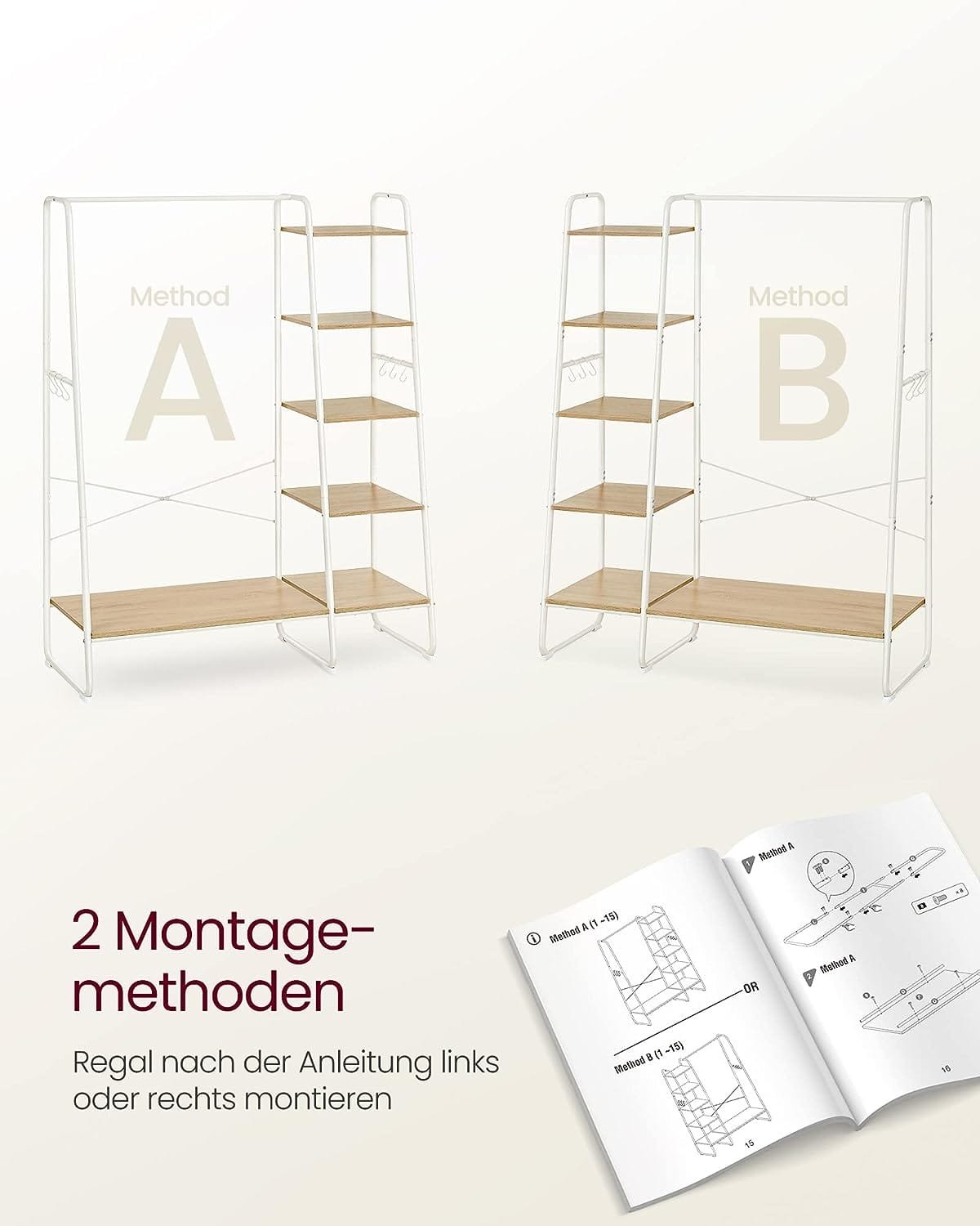 [Multipurpose] Denna öppna garderob passar perfekt in i sovrummet, omklädningsrummet eller hallen – Beroende på dina behov kan 5 -nivå hyllan fästas till höger eller vänster sida av klädstället
