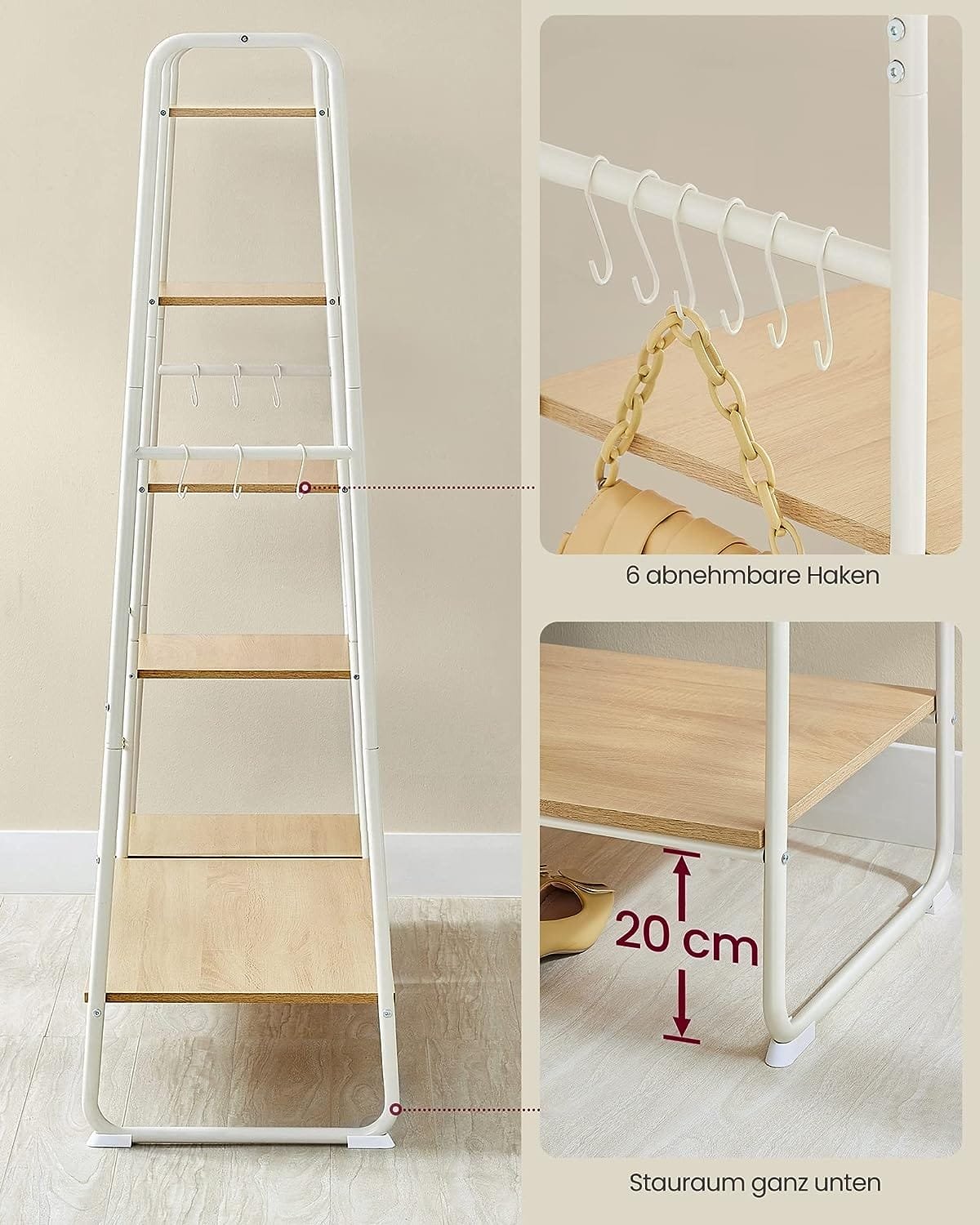 [Allt-i-ett klädställ] En klädskena för jackor eller skjortor, 6 hyllor för väskor, lådor eller växter, sidoskenor med 6 avtagbara krokar för hattar eller tillbehör, ytterligare förvaringsutrymme längst ner för skor