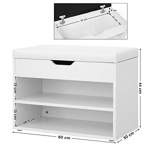 I smakfull Matt White; Hålen för skruvar är inte synliga från utsidan, därför vackert utseende; Det finns ett urtag under det gångjärnslocket så att du bekvämt kan öppna locket; Golvgliderna tillåter ett säkert stativ och skyddar golvet i skobänken från vatten och fukt