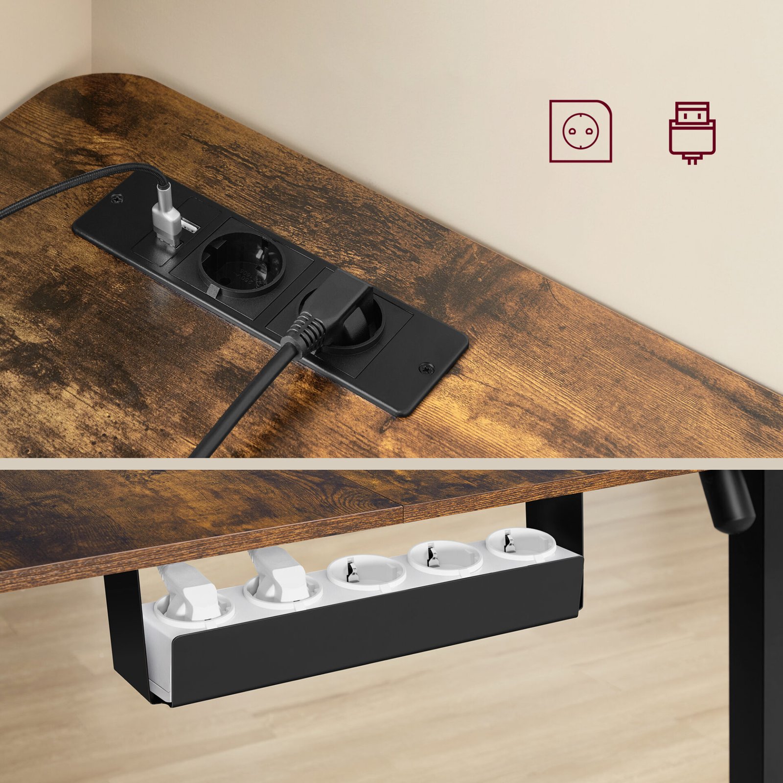 Features :Colors: Rustic Brown, Ink BlackMaterials: Chipboard, steelDimensions : 140 x 160 x (72-120) cm (P x L x H)Weight: 32.9 kgMaximum static load capacity: 80 kgDelivery :1 x Corner desk with power strip1 x Mounting Kit6 x Locking Casters1 x User Manual