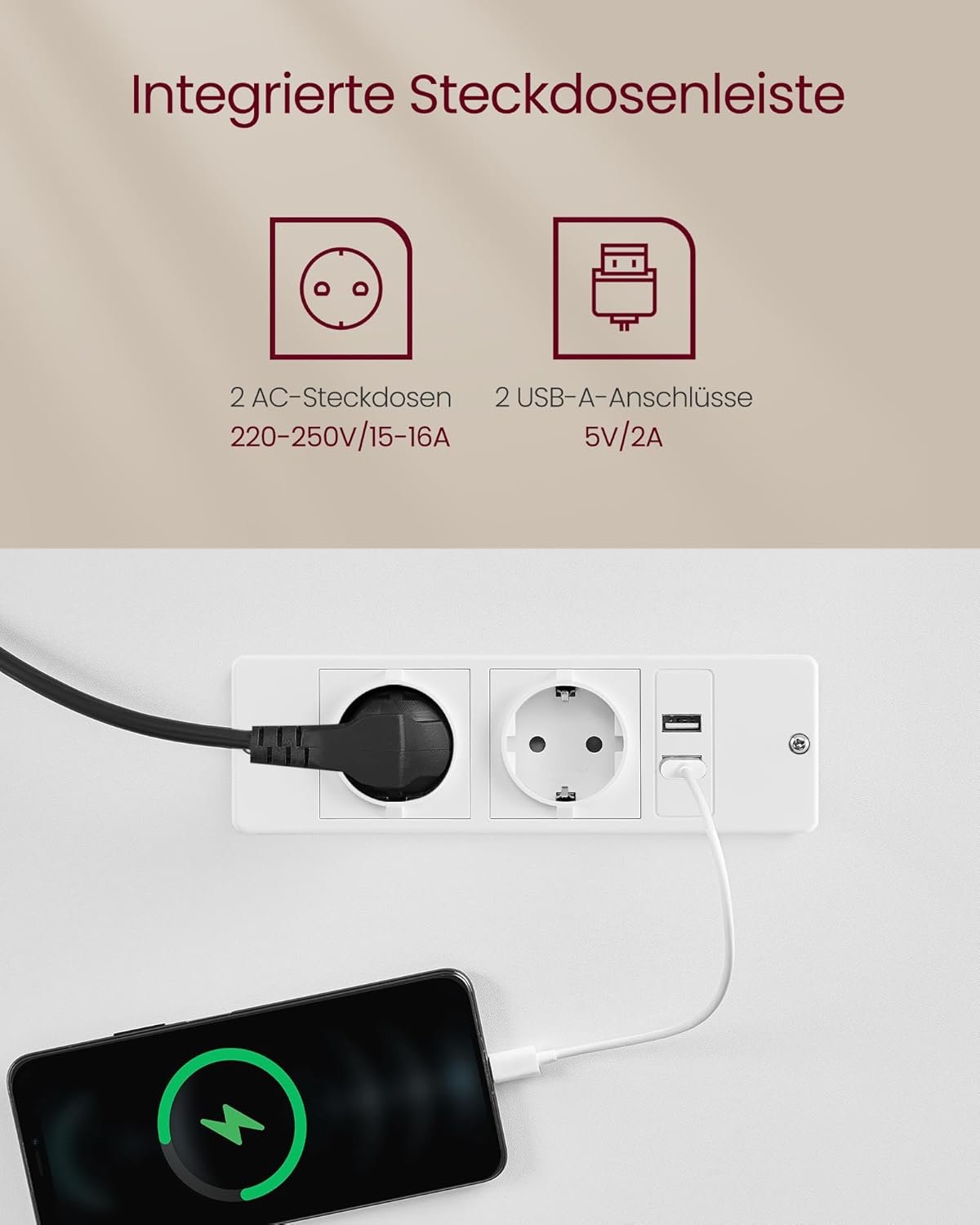 Adjustable height and memory function: This table is smoothly height-adjustable between 72 and 120 cm and has a very low noise level when adjusting the height (< 50 dB). A total of 4 heights can be saved as a quick setting. Built-in socket and integrated wiring: With 2 charging sockets (220V–250V, 15A–16A) and 2 USB ports; thanks to the integrated wiring, only one cable is required to connect the power for the motor and charge your devices together. Spliced table top: Different colours and appropriate splicing proportions add style to this desk and create a productive working atmosphere. Drawer and hook: A small drawer (22.7 x 32.5 x 4 cm) for office supplies, the top of the drawer for laptop or documents; the side hook can be used for hanging headphones to make it easier to access. Robust and stable: Double support bars and robust legs provide stable support (up to 80 kg); the adjustable feet can be replaced by 4 wheels with brakes, thanks to the brakes, you don't have to worry about stability. Product Details:Color: Cloud White-Golden OakMaterial: Particleboard, SteelSize: 70 x 160 x (72-120) cm (D x W x H)Tabletop Thickness: 1.5 cmNoise Level: <50 dBAdjustment Speed: 25 mm/sWeight: 34.1 kgMax. Static Load Capacity: 80 kgIncluded:1 x Desk1 x Controller1 x Drawer1 x Power Socket1 x Hook4 x Casters1 x Accessory Kit1 x Instructions