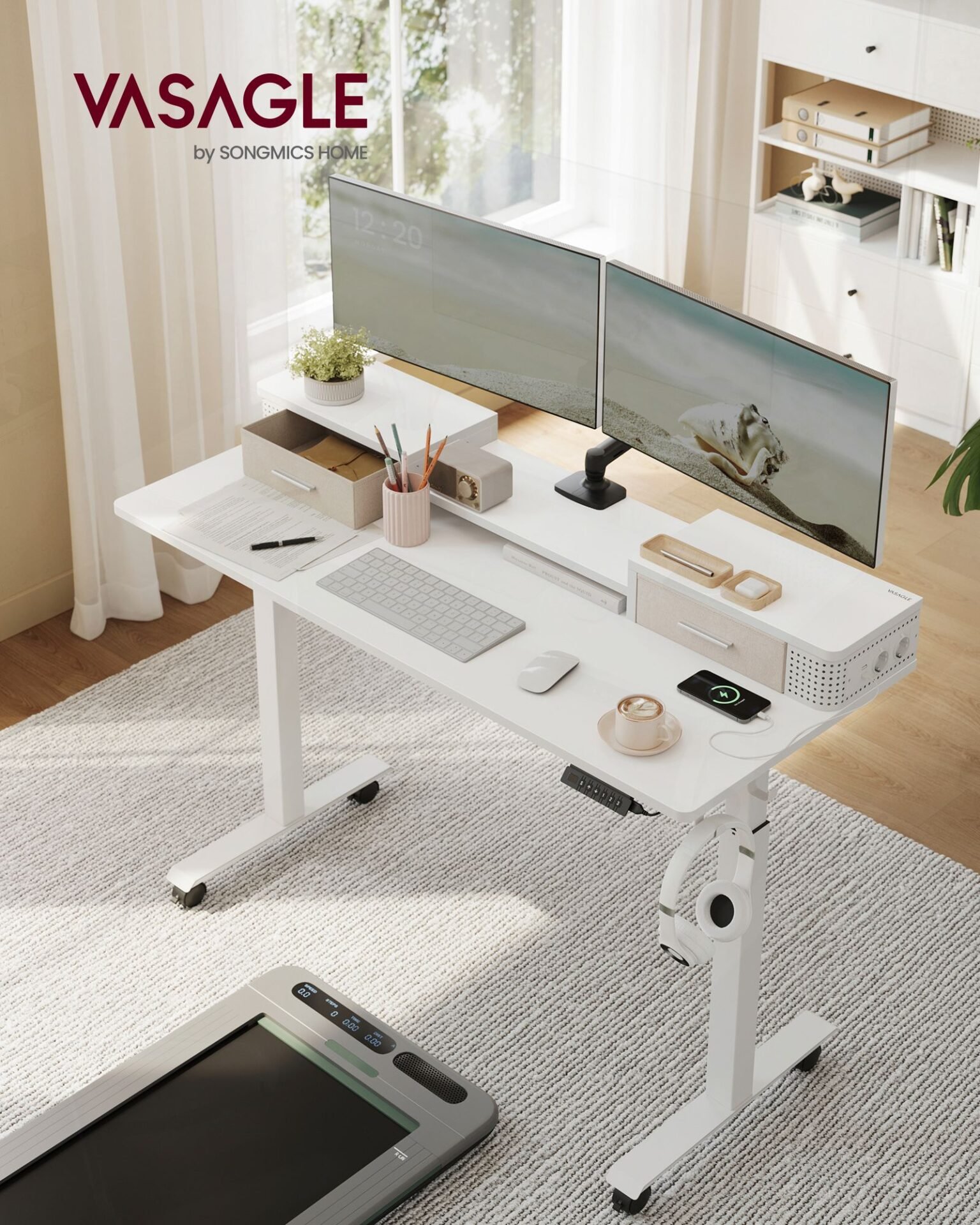 [Pick, store, charge] The middle shelf of the monitor stand is height adjustable; on its two sides there are 2 drawers for small items; perforated plates for hiding cables and 2 AC outlets and 2 USB ports for charging