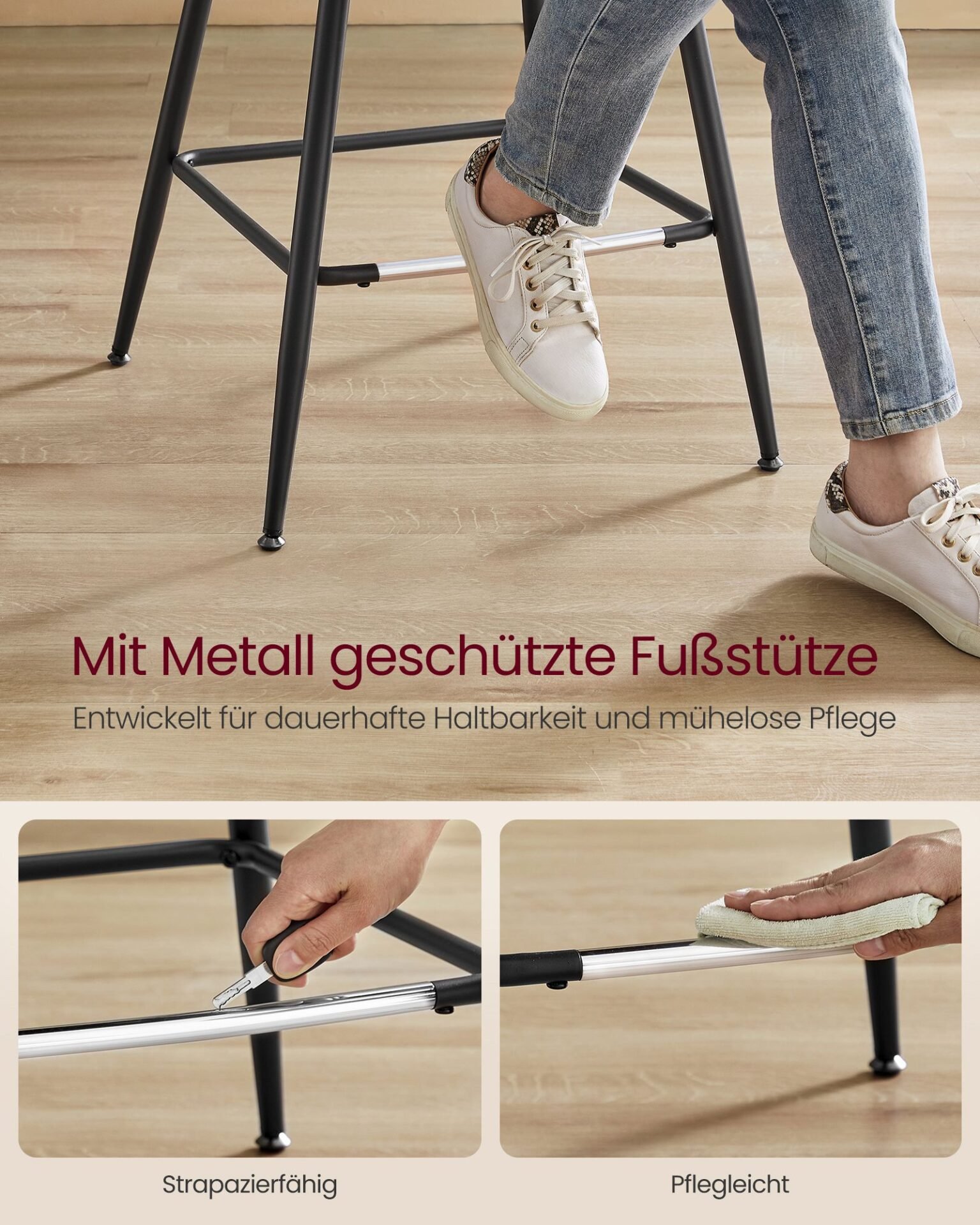 [Sturdy Footrest with Metal Protection] Each of these dining stools features a footrest with metal protection designed for durability and ease of cleaning, even when stepped on by shoes
