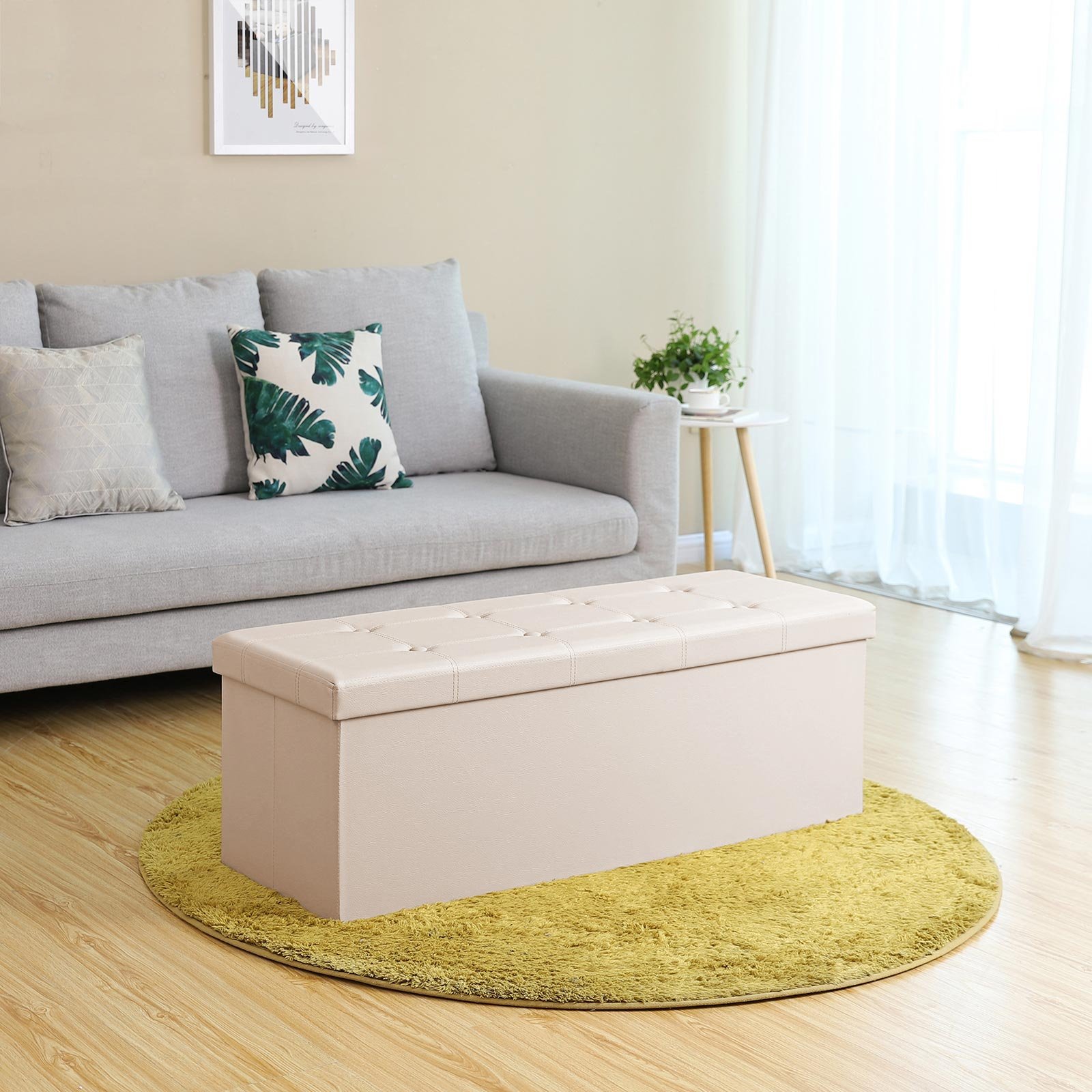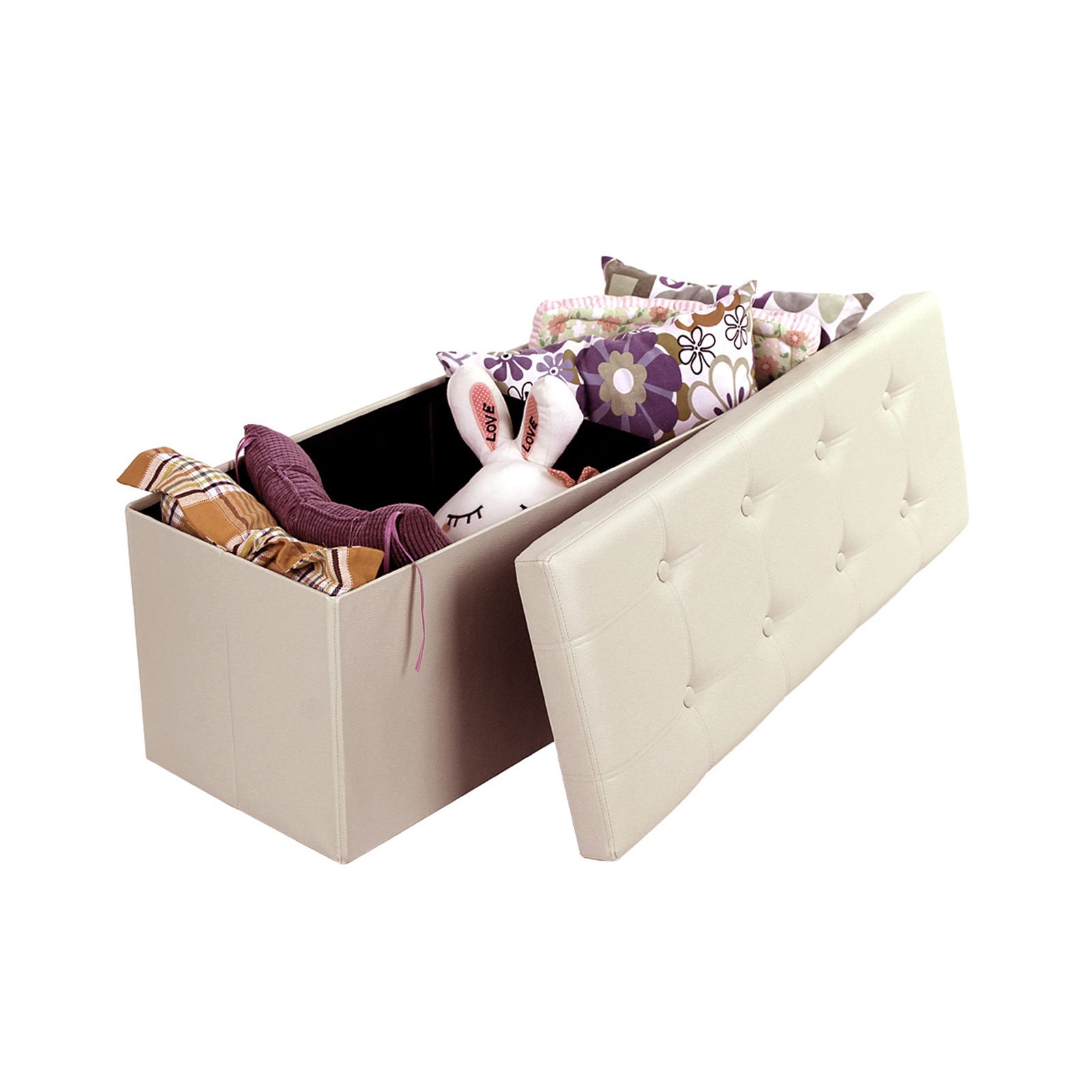 Specifications:- Product size: 110 x 38 x 38 cm (W x D x H)- Inner size: 107 x 34 x 33.5 cm- Folded size: 110 x 38 x 5 cm- Color: beige- Material: PU, E1 grade MDF- Weight: 9.4 kg- Max. load capacity: 300 kgPackage Contents:- 1 x Storage OttomanNotes:- Please do not stand on the product. Do not sit down violently or suddenly.- The product is not a toy, children are not allowed to climb or play on it.- The size and color may differ slightly due to material feature or camera lighting.