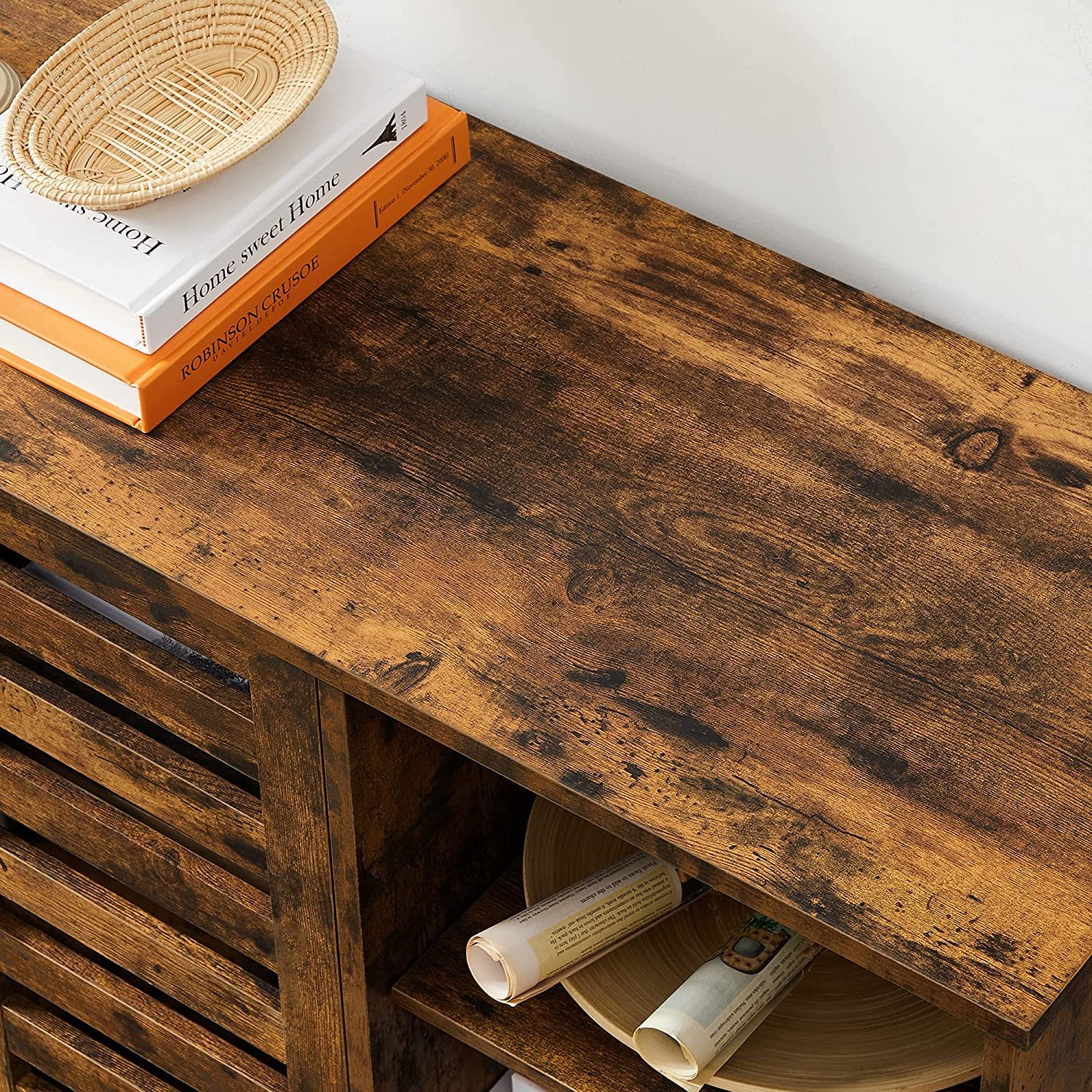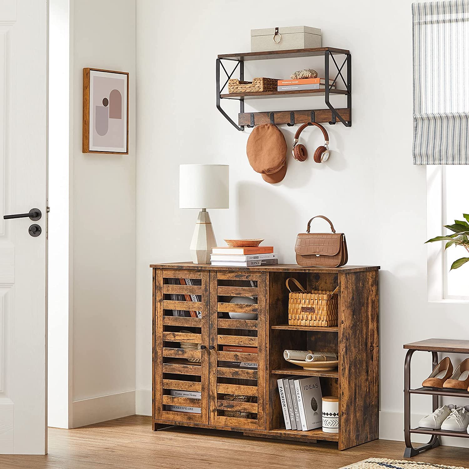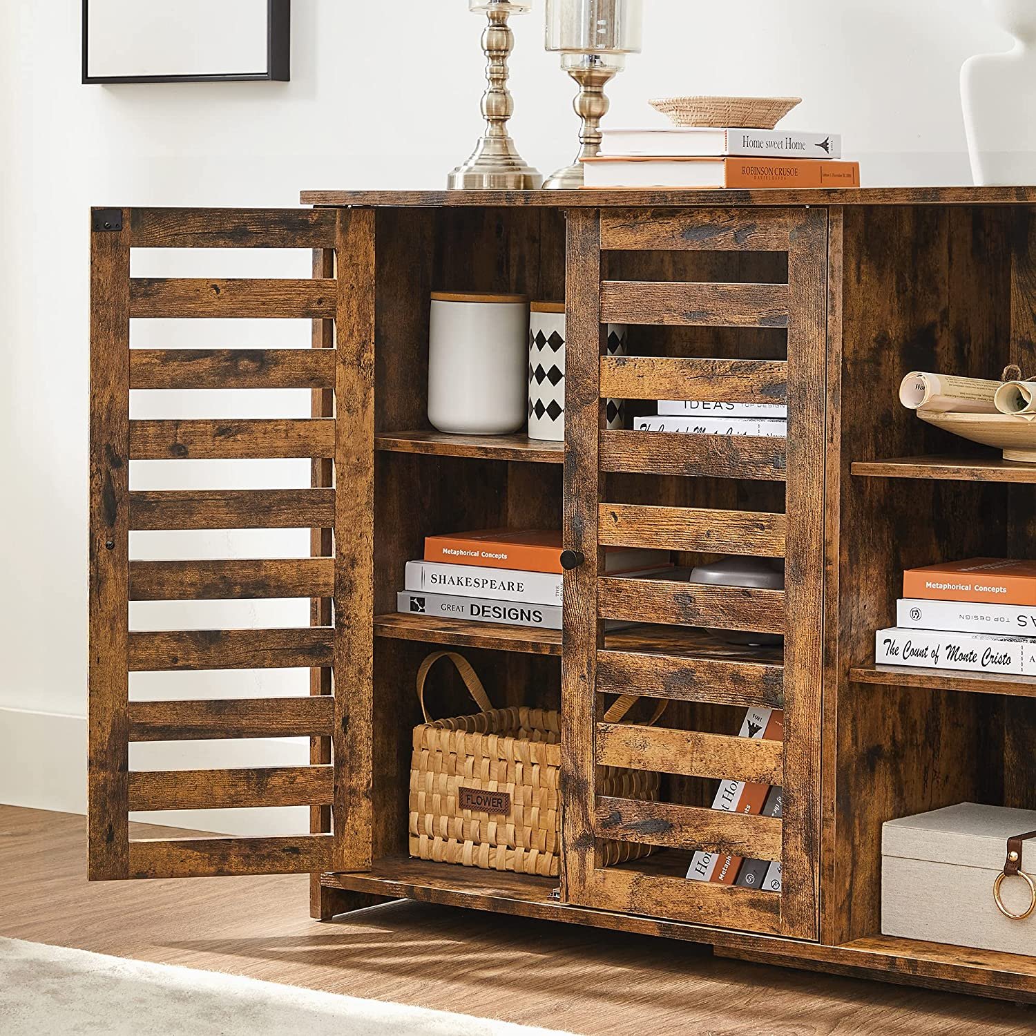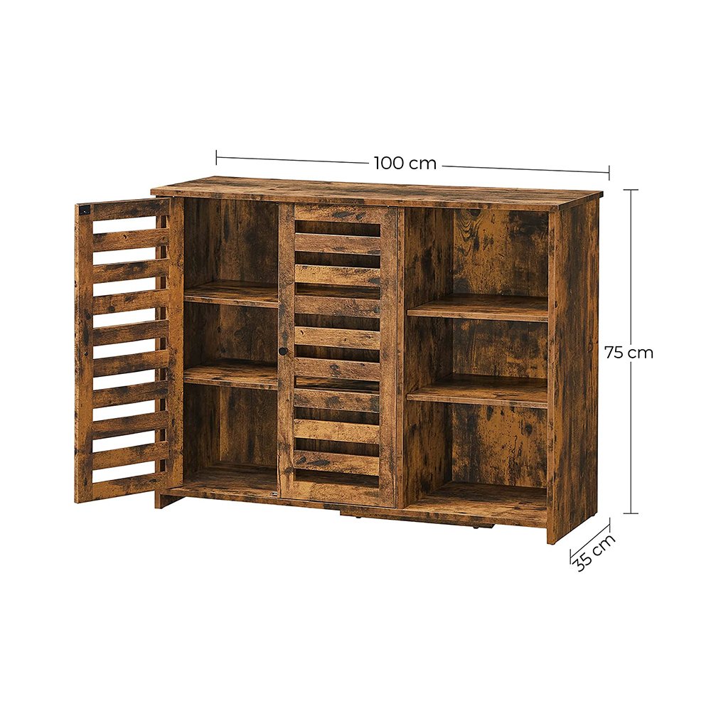 WHAT YOU GET: A 110 x 35 x 75 cm rustic wood colour storage cabinet with 3 open compartments and 2 slat doors that provide both open and hidden storage space and enhance your home