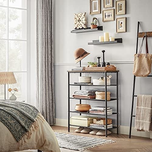 Vasagle Skoställ 5-lagers med 4 tyghyllor och topp, Stålram, Rustik Brun och Svart