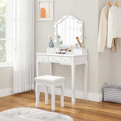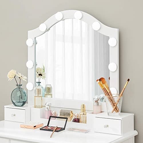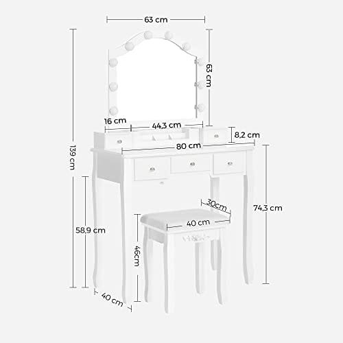 Vasagle sminkbords set, stoppad pall, 10 lampor, löstagbar förvaringslåda, vit