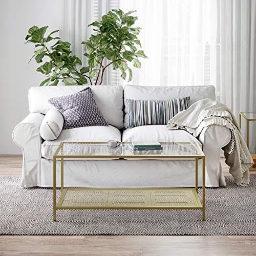 Specifikationer: Färg: guld, transparent material: stål, härdat glas Produktstorlek: 41,7″L x 21,7″B x 17,7″H (106 x 55 x 45cm) Produktvikt: 28,4lb (12,9kg) Max statisk belastning för bordsskivan: 88,2lb (40 kg) Max statisk belastning på näthyllan: 44,1 lb (20 kg) Paketinnehåll: 1 x Soffbord 1 x Monteringssats 1 x Instruktioner
