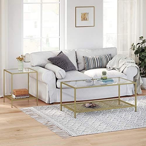 Vasagle soffbord med härdat glasskiva och näthylla, cocktailbord, guld och transparent färg
