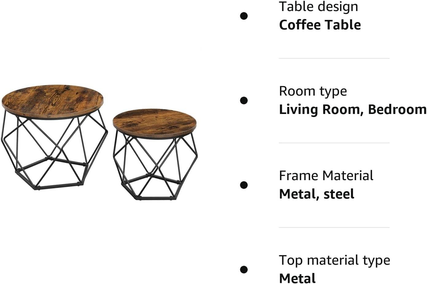 Specifikationer: Färg: Rustikbrun, svartmaterial: Partikelbord, stålframstorlek på stort soffbord: 50 x 40 cm (dia. X h) Storlek på litet soffbord: 40 x 36 cm (dia. X h) Total vikt: 6,9 kgmax. Statisk belastning av varje soffbord: 20 kgPackage Innehåll: 1 x Stora soffbord1 x Small Coffee Table1 x Montering Kit1 x Instruktioner (sv, de, fr, es, it)