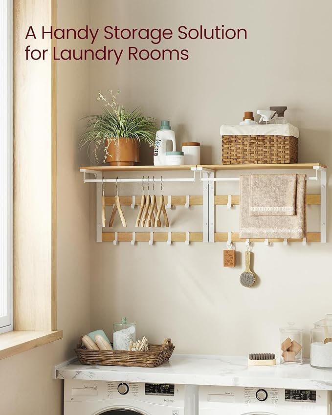 [Removable Hooks] The 10 removable hooks in 2 rows on this wall shelf allow you to adjust the distance between them to hang bags, clothes, and other items of different sizes
